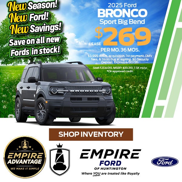 Stk# F251401s, MSRP: $33,310. No security deposit required. Excludes tax and fees. Includes $1500 conquest rebate. All applicable offers included in pricing. Lessee responsible for excess wear and mileage over 22,500 miles at $0.20 per mile. Lessee has option to purchase vehicle at lease end at price negotiated with dealer at signing. $395 lease disposition fee waived at lease end if vehicle is purchased or customer leases/purchases another new Ford/Lincoln vehicle. *On approved credit. Expires 4/30/26.