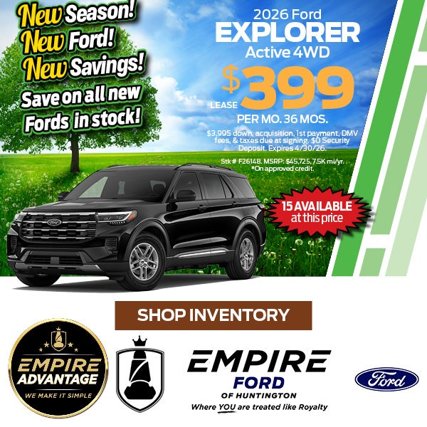 VIN# F26148. MSRP: $45,725. No security deposit required. Excludes tax and fees. Includes RCL Renewal. All applicable offers included in pricing. Lessee responsible for excess wear and mileage over 22,500 miles at $0.20 per mile. Lessee has option to purchase vehicle at lease end at price negotiated with dealer at signing. $395 lease disposition fee waived at lease end if vehicle is purchased or customer leases/purchases another new Ford/Lincoln vehicle. Must be a returning Ford leasee. *On approved credit. Expires 4/30/26.